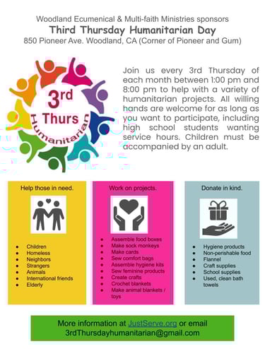 All of Woodland’s faith communities are invited to be members of WEMM, including those outside of Woodland but serving Woodland residents. For more information, or to join one of our meetings to check it out, contact WEMM’s secretary, Bob Pratt, 530-650-1683.